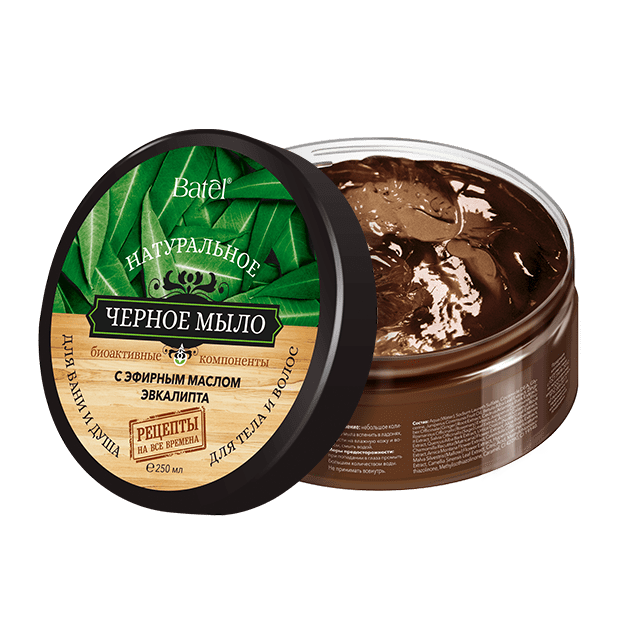 Для бани и душа. 16 полезных трав в составе! Густое черное мыло обладает выраженными увлажняющими и питательными свойствами, бережно смягчает кожу тела. Способствует тщательному очищению волос, восстанавливает их структуру, стимулирует обновление клеток кожи головы. Эфирное масло эвкалипта известно высоким содержанием фитонцидов – веществ, которые активно подавляют и убивают рост и развитие болезнетворных бактерий.