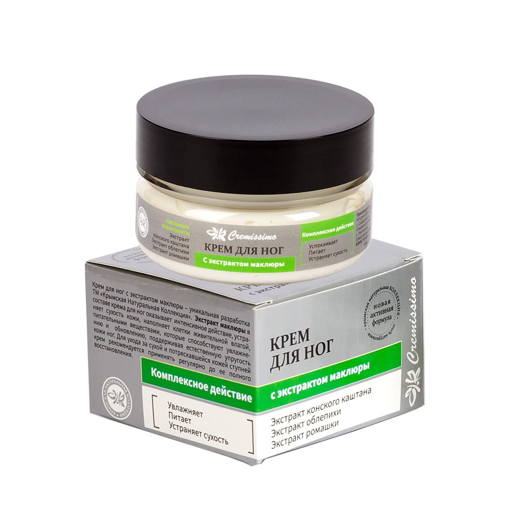 Крем для ног с экстрактом маклюры – уникальная разработка ТМ «Крымская Натуральная Коллекция». Экстракт маклюры, в составе крема для ног, оказывает интенсивное действие, устраняет сухость кожи, наполняет клетки живительной влагой, питательными веществами, которые способствуют увлажнению и обновлению, поддерживая естественную упругость кожи ног. Для ухода за сухой и потрескавшейся кожей ступней крем рекомендуется применять регулярно до ее полного восстановления.