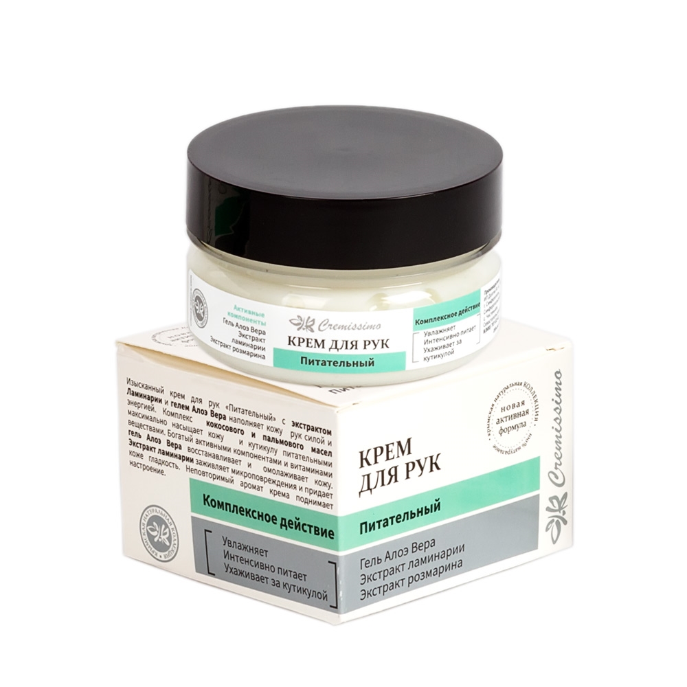 Изысканный крем для рук «Питательный» с экстрактом Ламинарии и гелем Алоэ Вера наполняет кожу рук силой и энергией. Комплекс кокосового и пальмового масел максимально насыщает кожу и кутикулу питательными веществами. Богатый активными компонентами и витаминами гелем Алоэ Вера восстанавливает и омолаживает кожу. Экстракт Ламинарии заживляет микроповреждения и придает коже гладкость. Неповторимый аромат крема поднимает настроение.