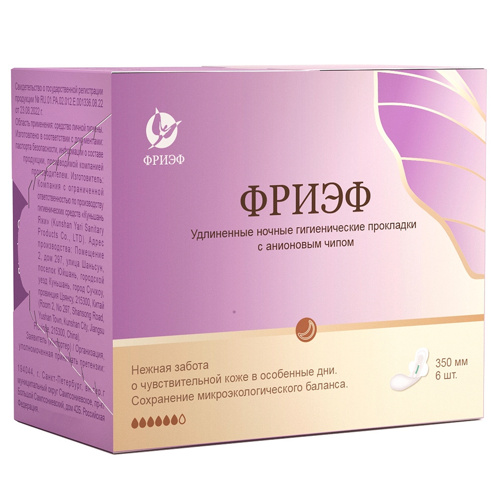 Удлиненные ночные гигиенические прокладки с анионовым чипом. "Фриэф", 350 мм, 6 шт